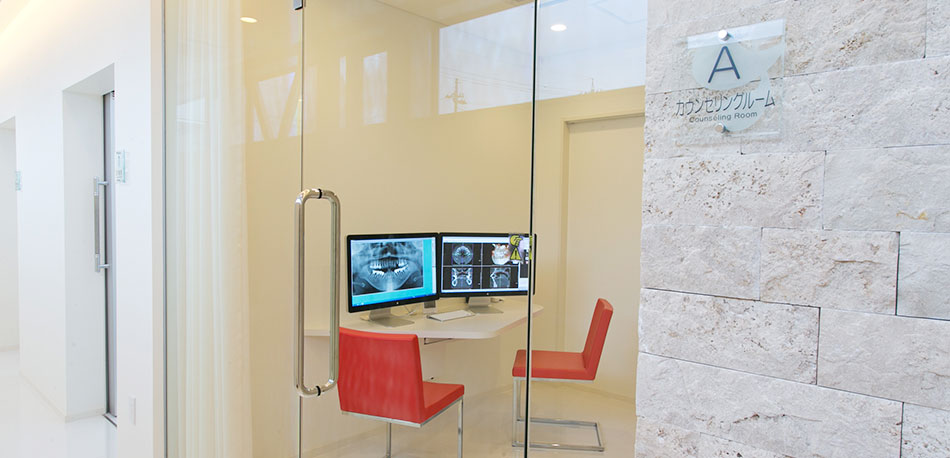 患者さんのプライバシーを重視した個室のスペースです。当院ではインフォームドコンセント(説明と同意)を重視しておりますので、悩みや不安な点、費用などについても、どうぞお気軽にご相談ください。
